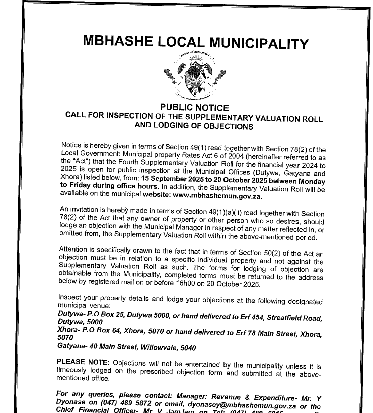 Welcome to Mbhashe Local Municipality, servicing the towns of Willowvale, Dutywa and Elliotdale